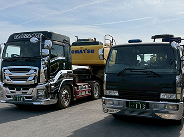 運送部では、骨材小売販売から産業廃棄物・公共事業に伴う土砂等の運搬を行っております。H28年より、一般貨物運送事業の許可を取得し安全運転を心掛けております。
